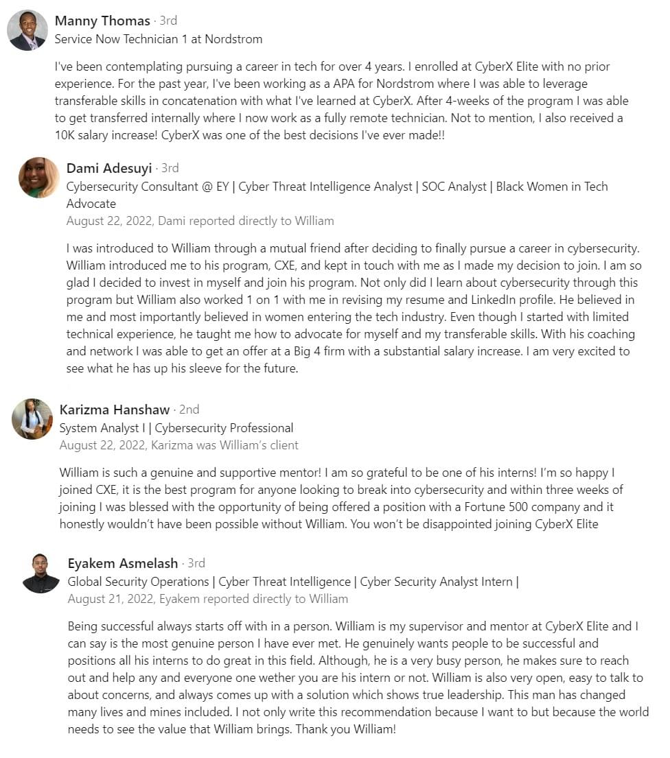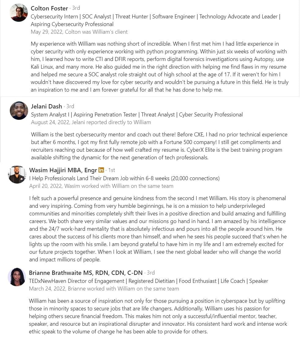 Since then, he has accumulated over 60M+ in cybersecurity salary offerings and has been shifting the dynamic and transcending the next generation of underrepresented cybersecurity leaders worldwide. His passion for helping others and strengthening his community has earned him a spot as one of the youngest members to join the 2022 Forbes Executive Business Council. Today, William travels the world teaching others how to develop skills that aren’t disposable in the age of Information Technology and secure their future in Cyberspace.